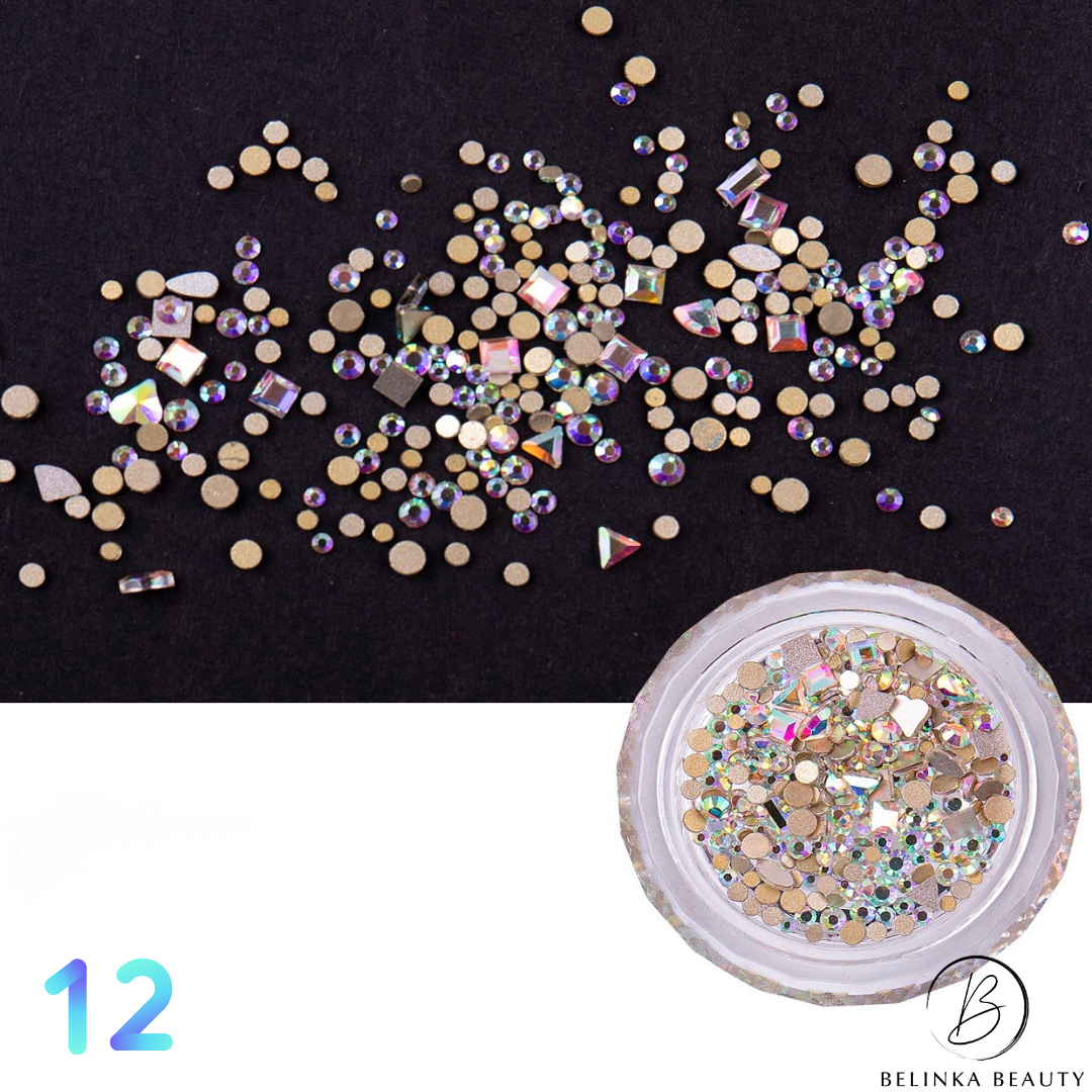 Mix of crystals of different types, sizes, shapes and colors for nail design
