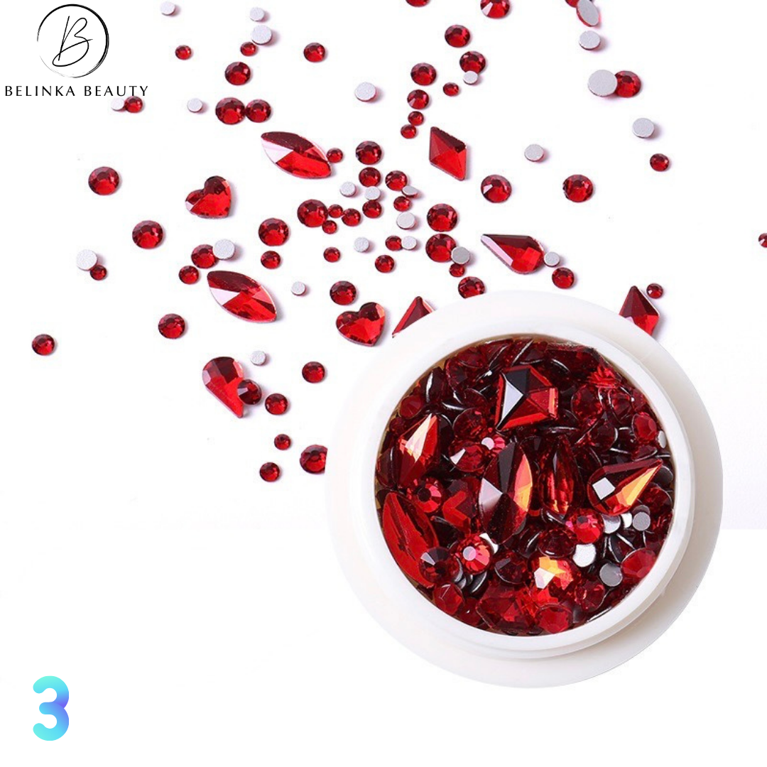 Mix of crystals of different types, sizes, shapes and colors for nail design