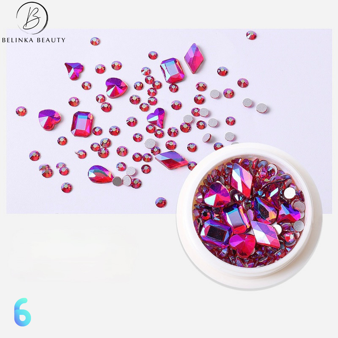 A mix of crystals of different types, sizes, shapes and colors for nail design