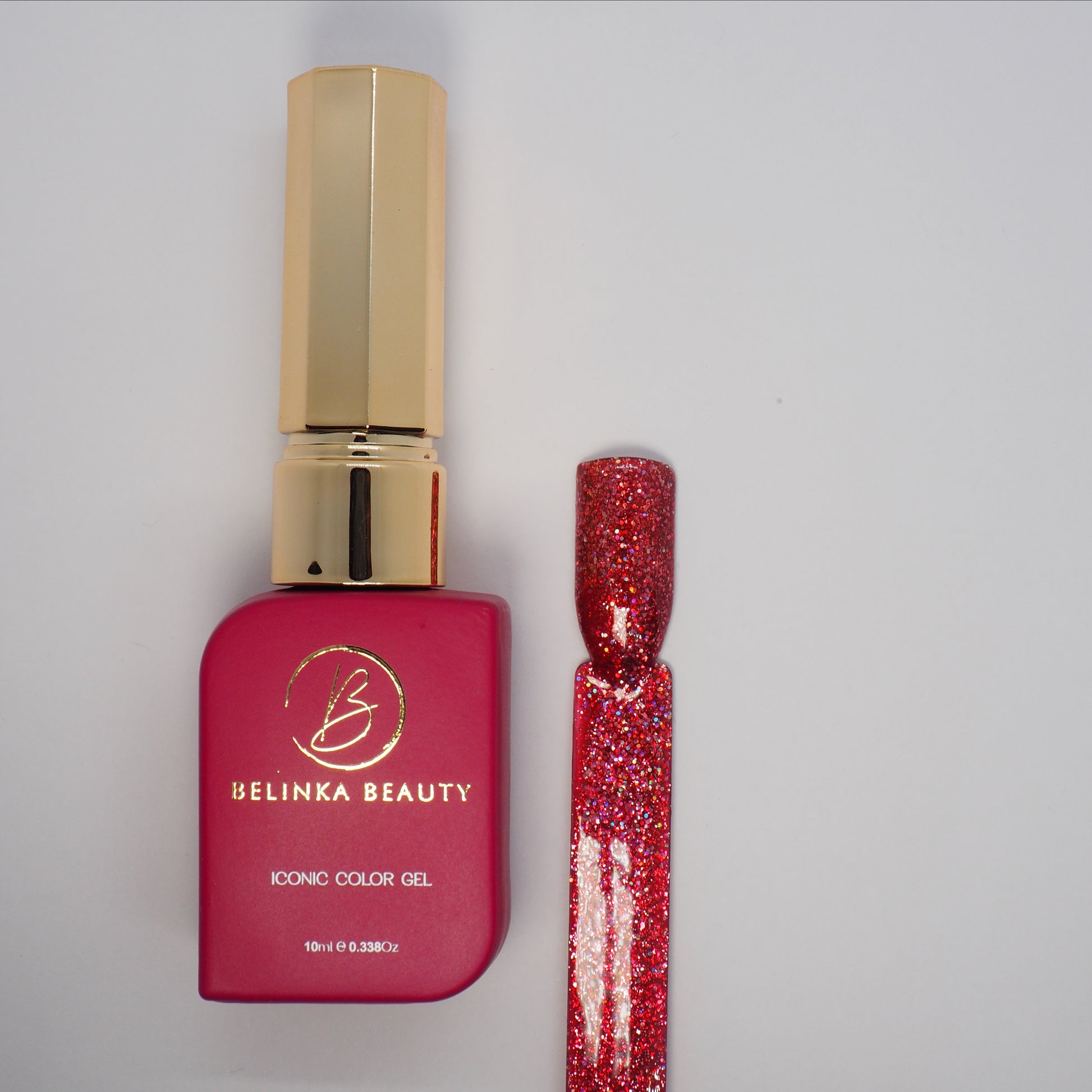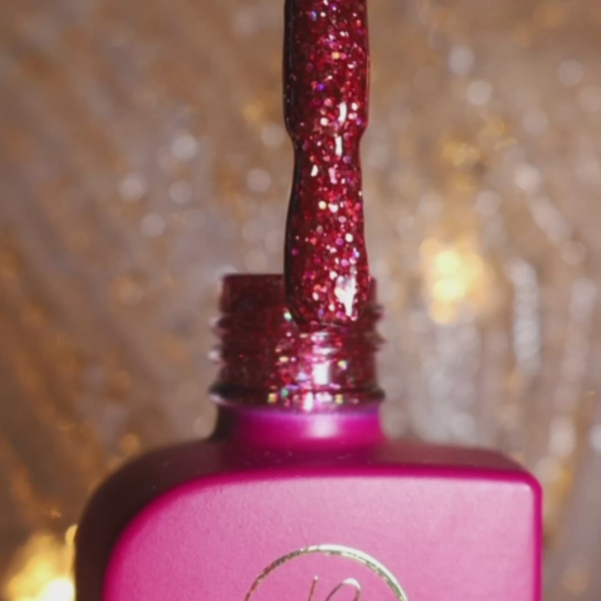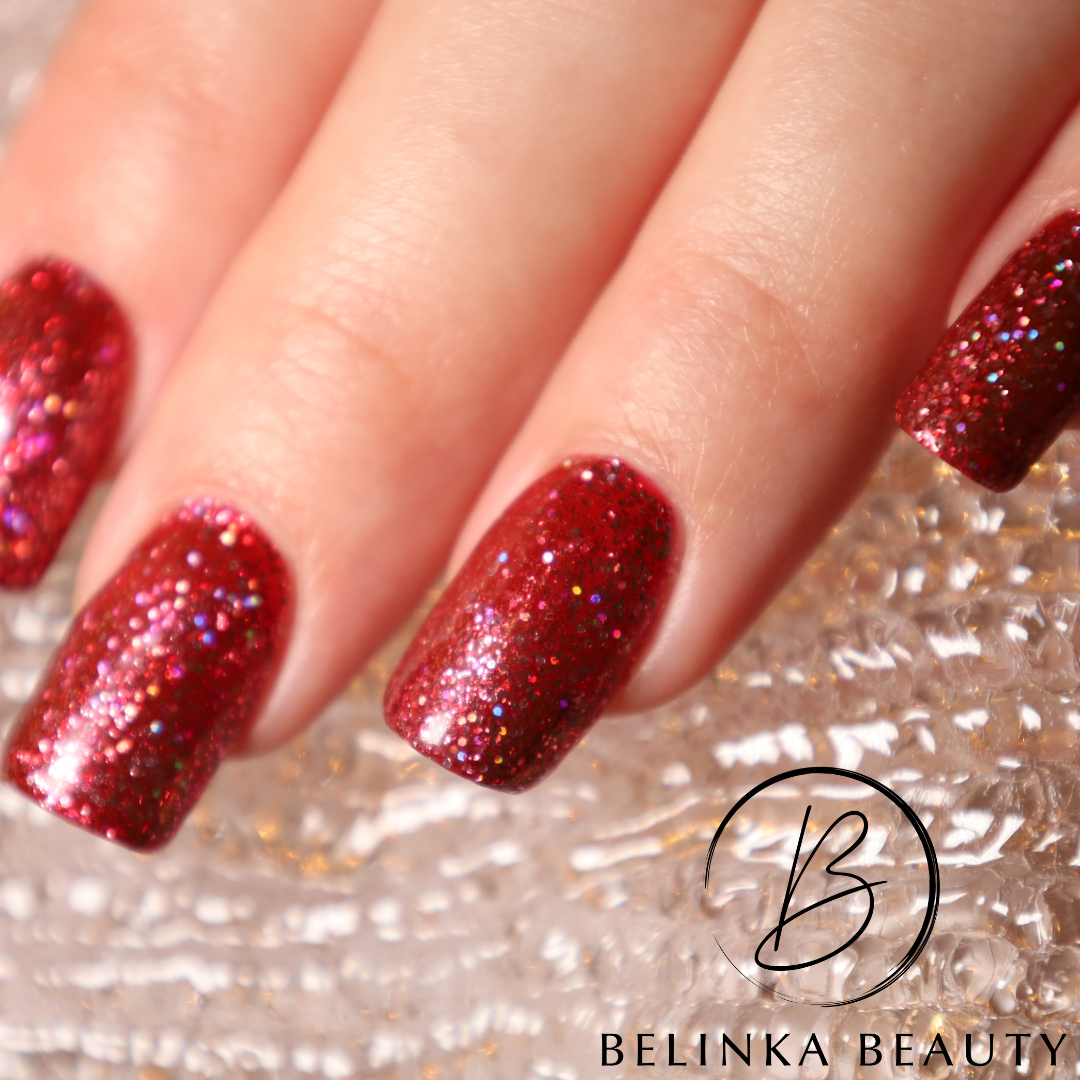 Rote Gelbasis und eine große Menge Glitzer sorgen für perfekte Deckkraft in nur einer Schicht. Nicht nur die Lichter am Weihnachtsbaum funkeln, sondern auch Ihre Nägel.