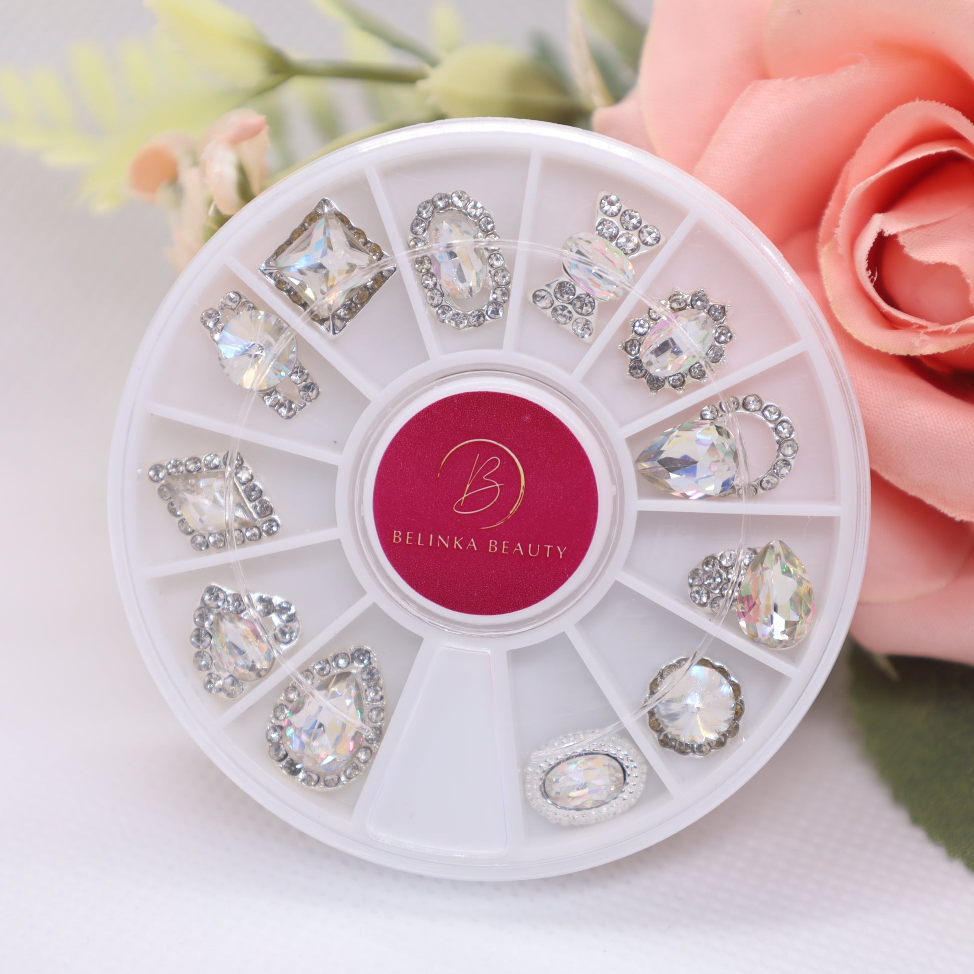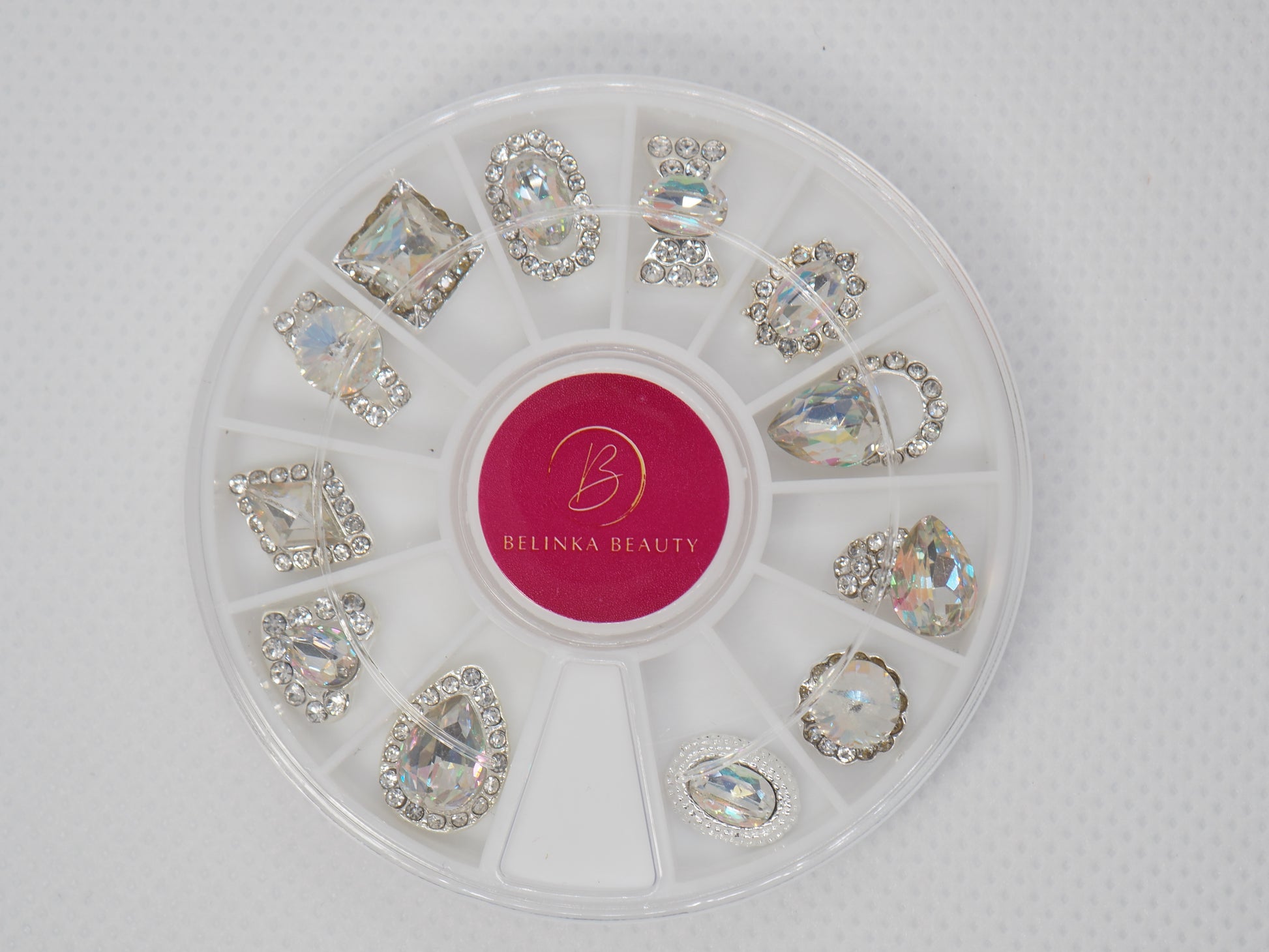 Das Karussell enthält 12 wunderschöne hochwertige Nagelschmuckstücke. Sie sind von unten sanft abgerundet, um sich besser an den Nagel anzupassen. Steine unterschiedlicher Art und Größe haben ein helles und klares Aussehen und einen diamantähnlichen Schliff, der deutliche Reflexe erzeugt. Die Mischung hochwertiger Metalle garantiert, dass der Schmuck lange Zeit glänzend und leuchtend bleibt, ohne dass es zu nennenswerten Farbveränderungen kommt. Es verdunkelt nicht, es wird nicht schwarz, es läuft nicht an und vor allem bleibt es schön bis zur nächsten Nagelumarbeitung (mit unserem Iconic Fixing Gel).