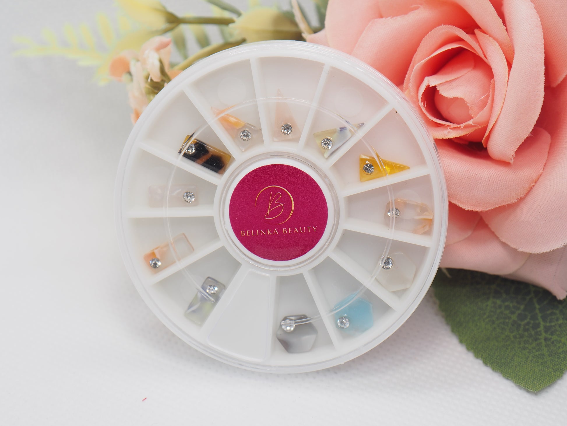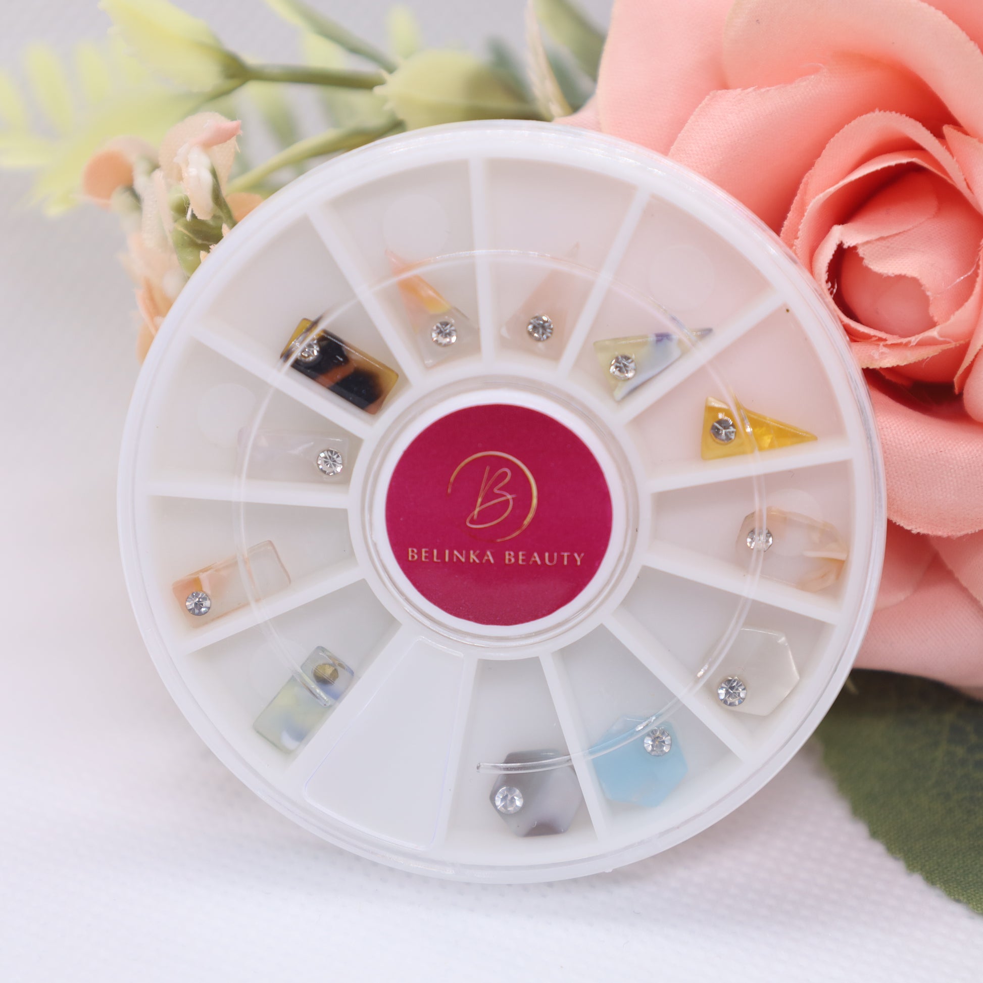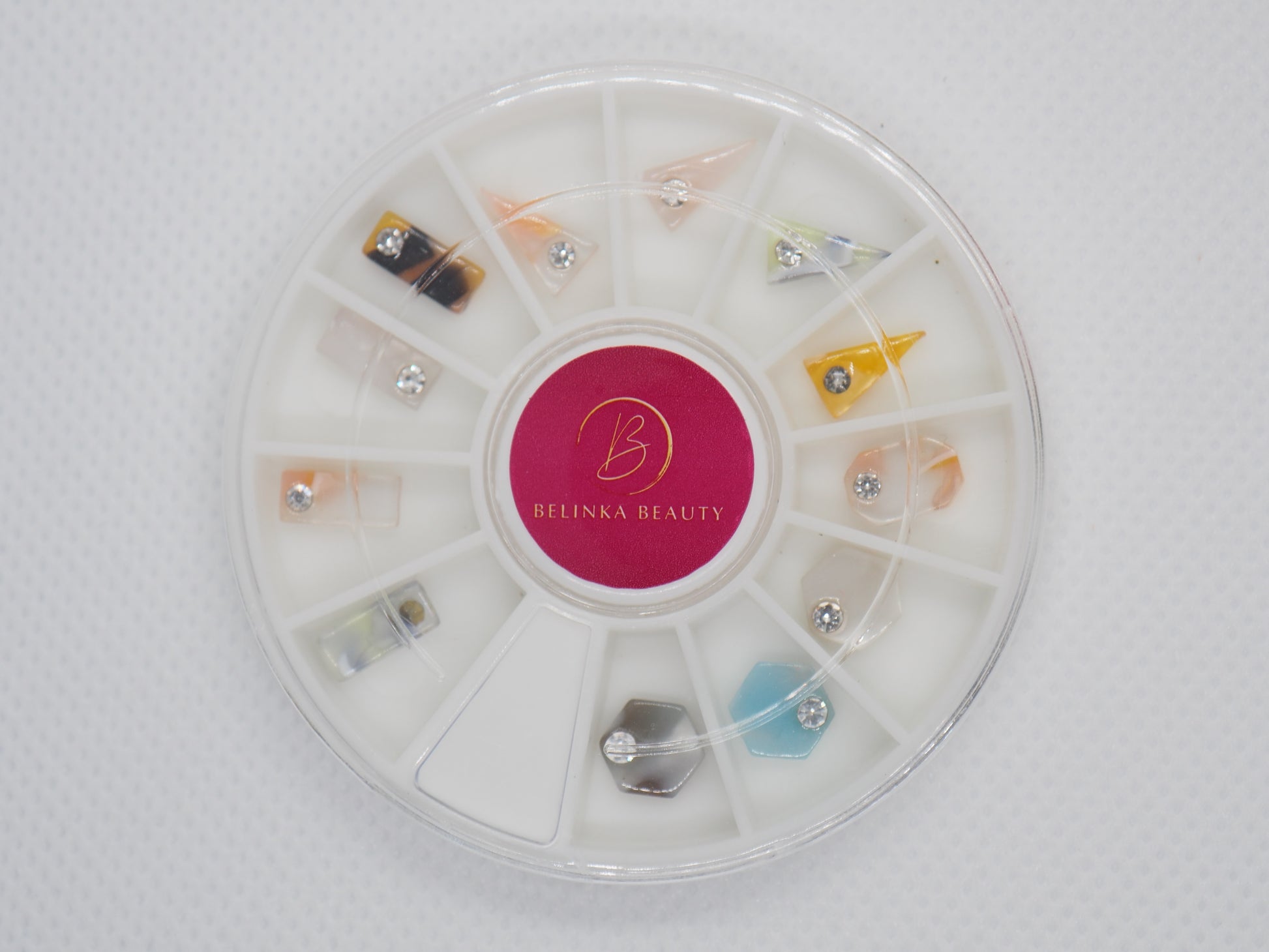 Das Karussell enthält 12 wunderschöne hochwertige Nagelschmuckstücke. Sie sind von unten sanft abgerundet, um sich besser an den Nagel anzupassen. Steine unterschiedlicher Art und Größe haben ein helles und klares Aussehen und einen diamantähnlichen Schliff, der deutliche Reflexe erzeugt. Die Mischung hochwertiger Metalle garantiert, dass der Schmuck lange Zeit glänzend und leuchtend bleibt, ohne dass es zu nennenswerten Farbveränderungen kommt. Es verdunkelt nicht, es wird nicht schwarz, es läuft nicht an und vor allem bleibt es schön bis zur nächsten Nagelumarbeitung (mit unserem Iconic Fixing Gel).