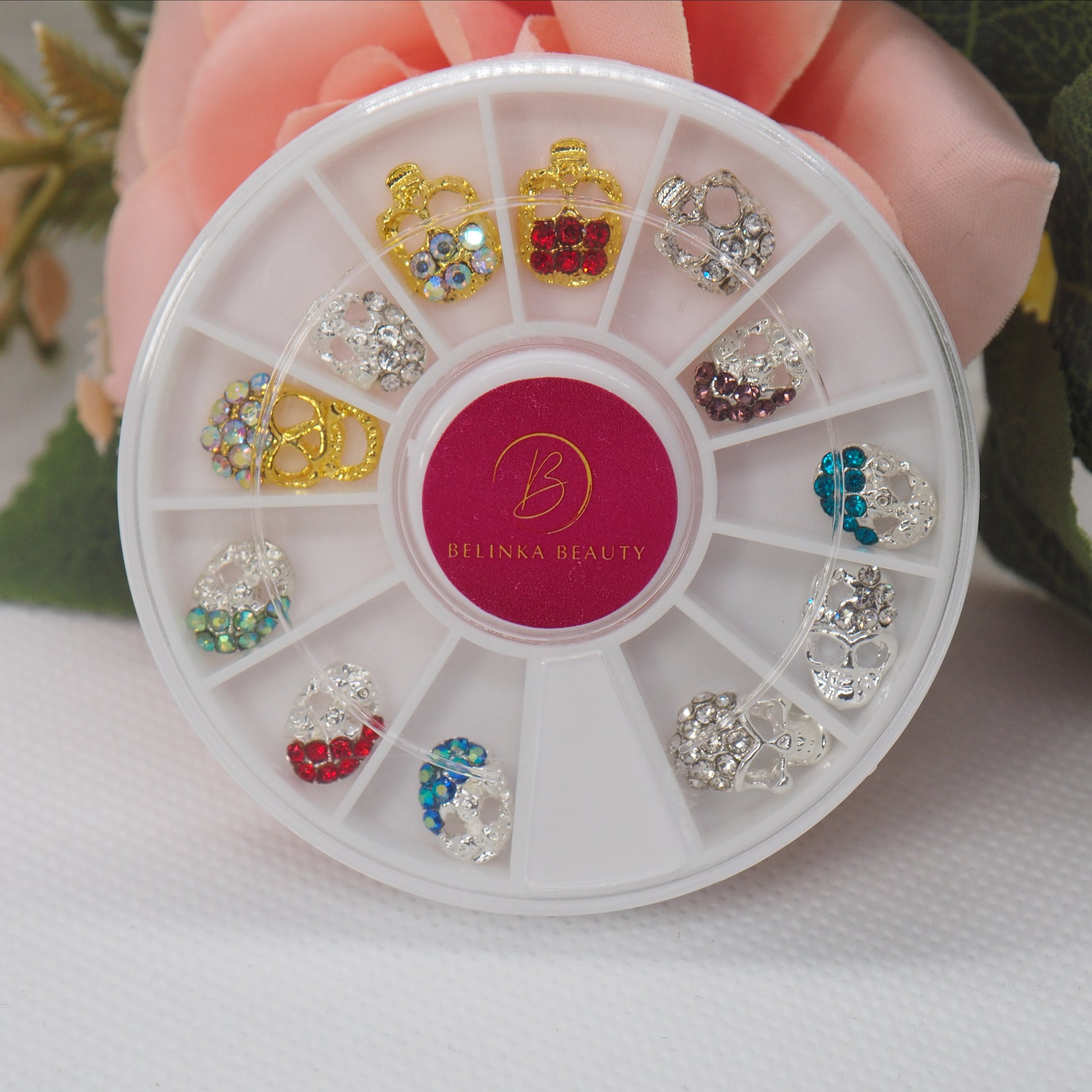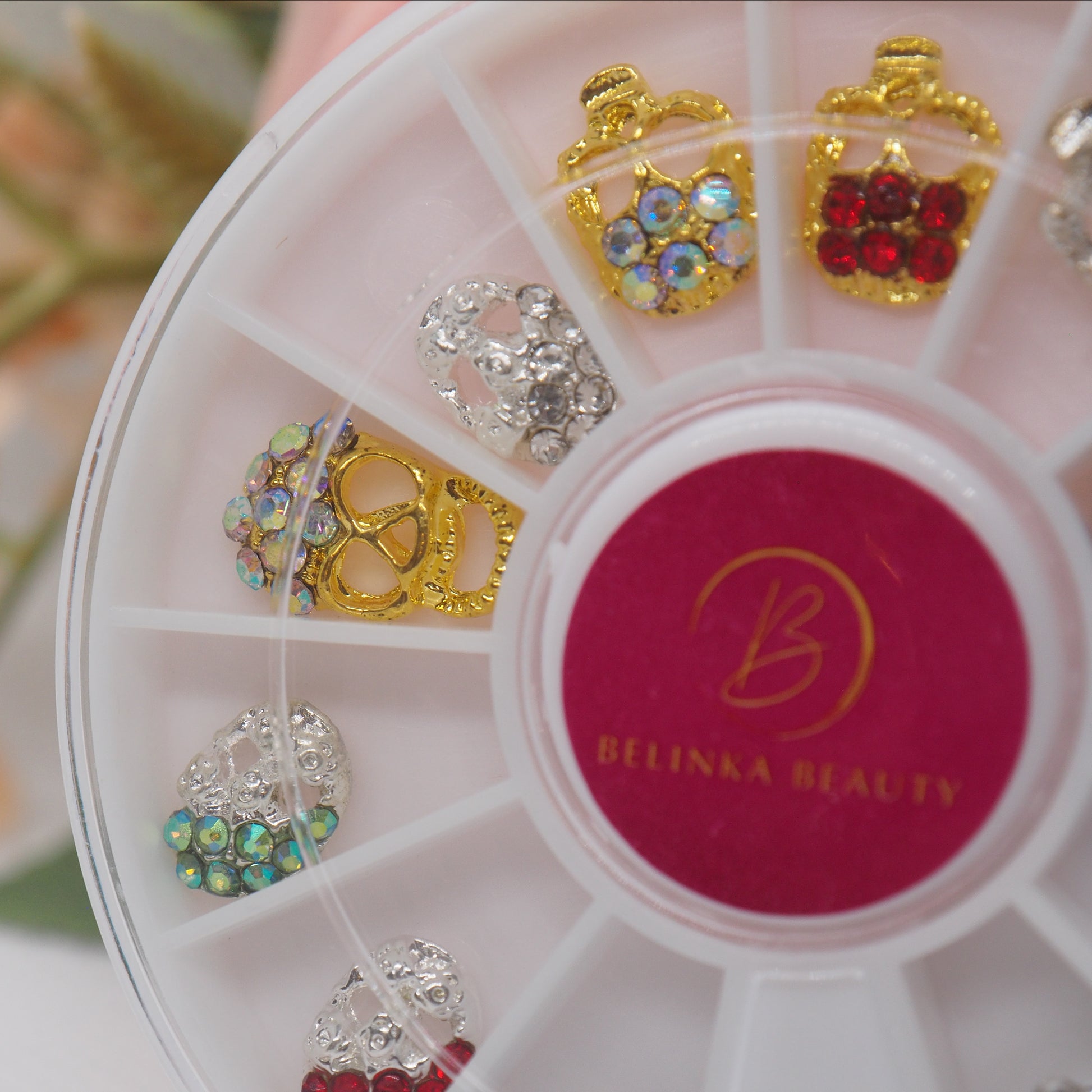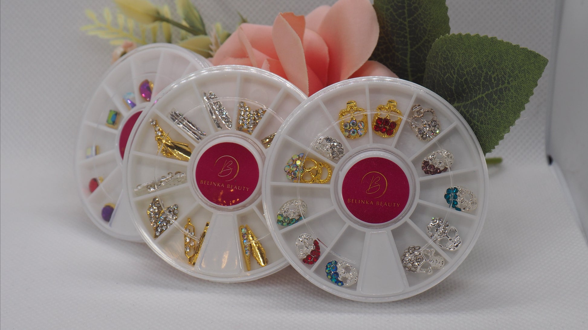 Das Karussell enthält 12 wunderschöne hochwertige Nagelschmuckstücke. Sie sind von unten sanft abgerundet, um sich besser an den Nagel anzupassen. Steine unterschiedlicher Art und Größe haben ein helles und klares Aussehen und einen diamantähnlichen Schliff, der deutliche Reflexe erzeugt. Die Mischung hochwertiger Metalle garantiert, dass der Schmuck lange Zeit glänzend und leuchtend bleibt, ohne dass es zu nennenswerten Farbveränderungen kommt. Es verdunkelt nicht, es wird nicht schwarz, es läuft nicht an und vor allem bleibt es schön bis zum nächsten Nagel-Makeover (mit unserem Iconic Fixing Gel)