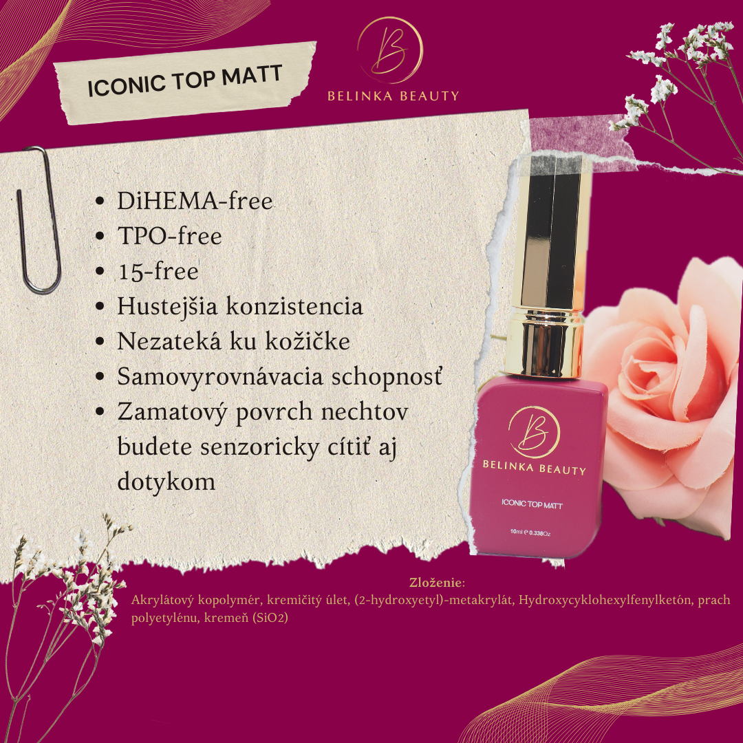 TIP: Po vytvrdnutí v UV/LED lampe nechajte Iconic Top Coat Matt tzv. Vychladnúť 1 až 2 minúty, až následne použite podľa potreby cleaner na dočistenie okolia nechtu, alebo olejček na nechtovú kožičku. Predídete tak vytvoreniu nevzhľadných fľakov na matnom povrchu.
