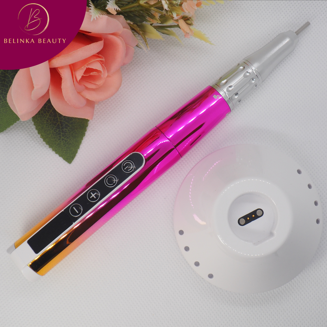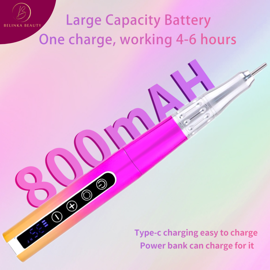 Profesionálna elektrická brúska na nechty BELINKA BEAUTY disponuje vstavanou batériou veľkosti 800 mAh, ktorá vydrží 4-6 hodín používania. Doplna ju nabijete za 2 hodiny a na nabitie môžete použiť dokovaciu stanicu, ktorá slúži aj ako stojan pre bity, alebo pripojením napájacieho kábla.